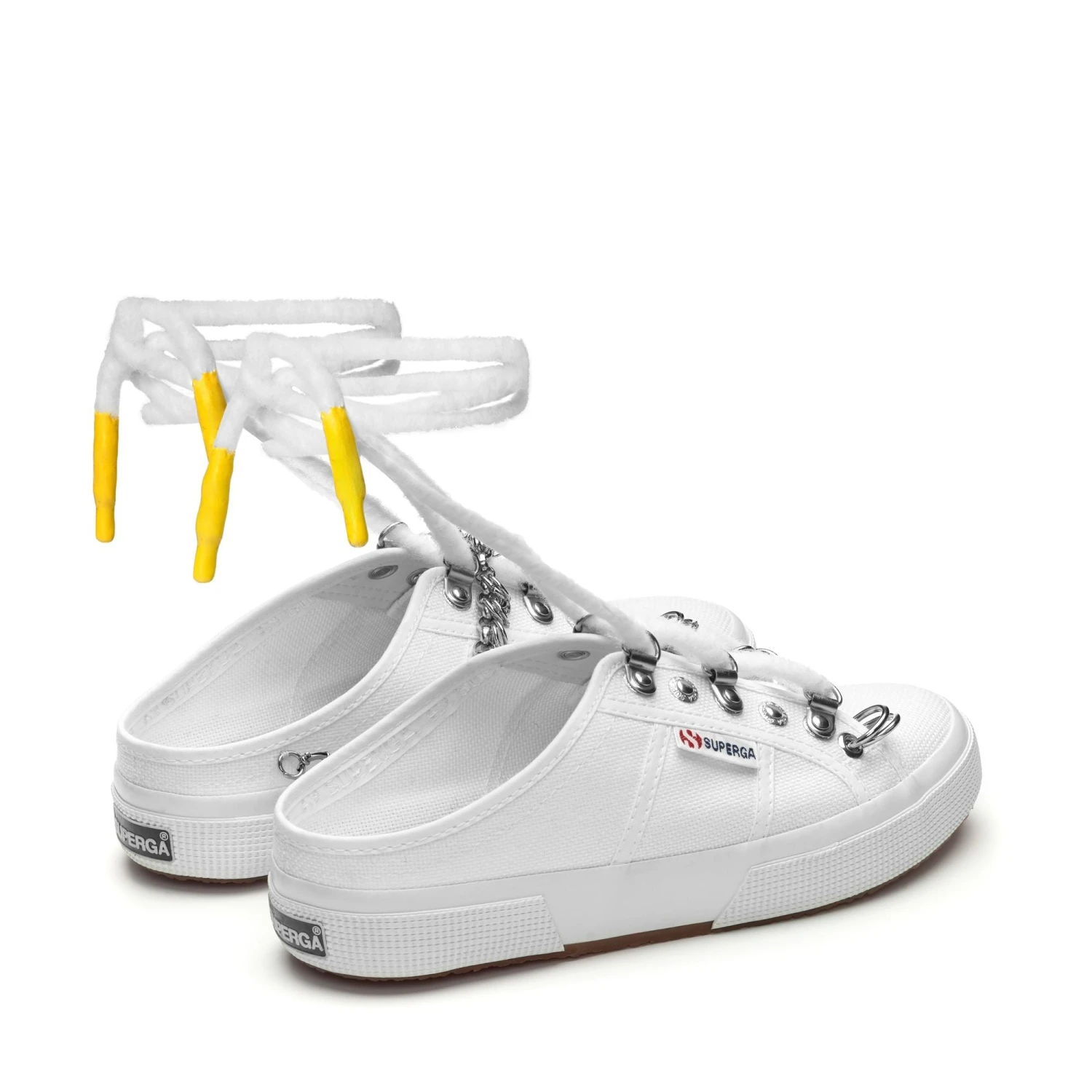 The finely cut tongue gives the shoes a moccasin-like appearance. The laces, to be tied to the slave, feature yellow silicone resin tips.