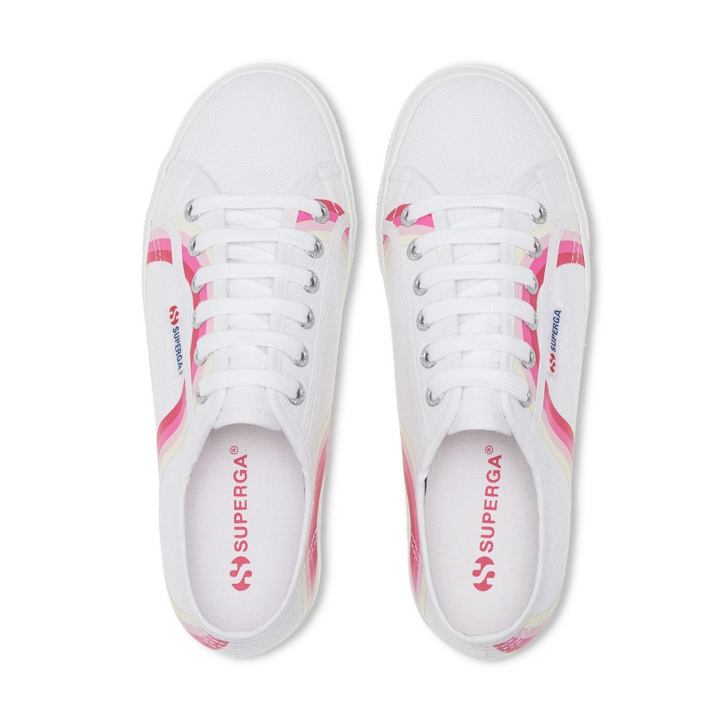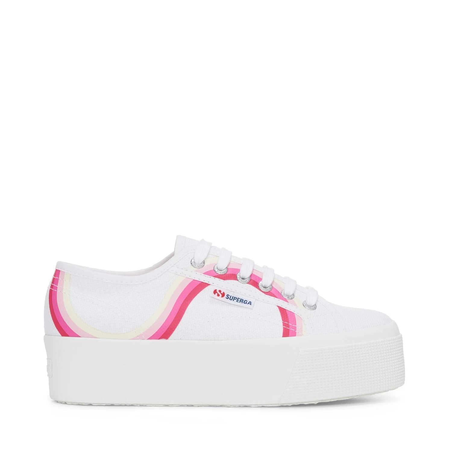 This icon is always on trend. The Superga 2790 sneaker has a classic silhouette with a 4 cm platform that elongates the figure and effortlessly pairs with denim and more feminine looks. The cotton canvas upper is decorated with a print of fluid colorful lines in high-contrast shades.